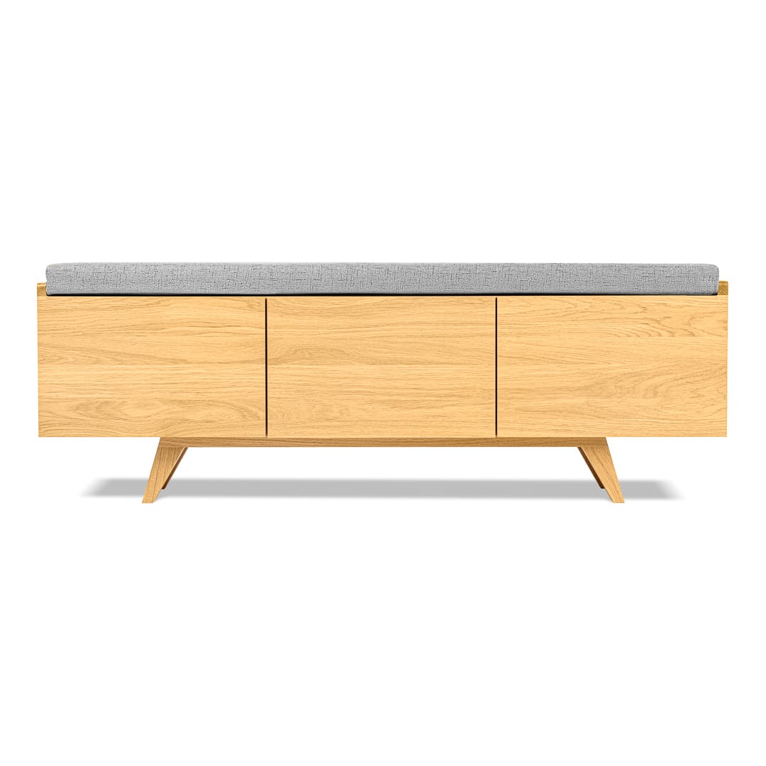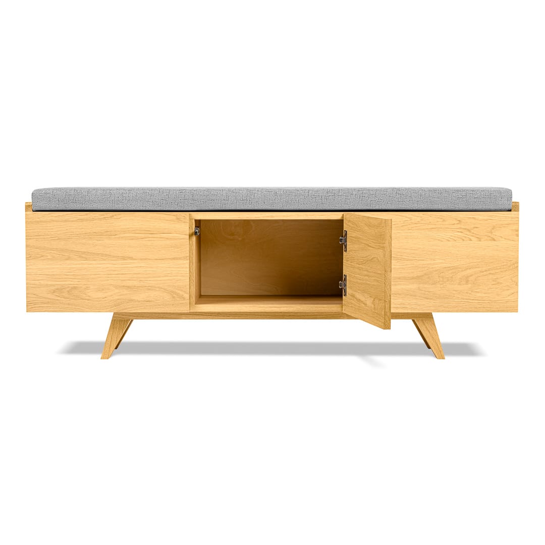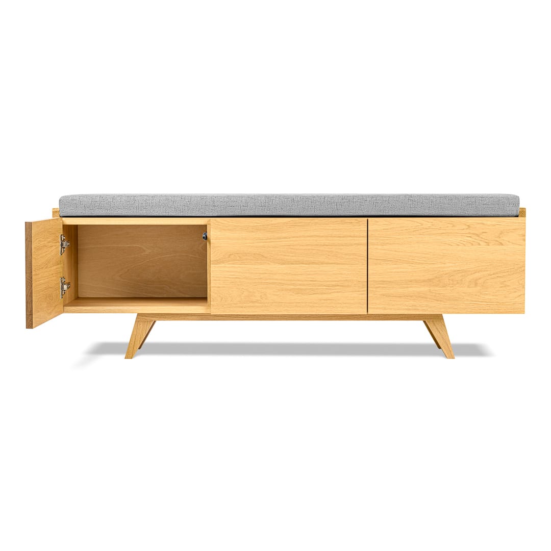 Możliwość personalizacji wymiarów ławki i kolorów poduszki sprawia, że ławka z powodzeniem może zagościć w każdym pomieszczeniu. Zaletą jest również wolna przestrzeń pod ławką którą także można swobodnie wykorzystać jako dodatkowe miejsce do przechowywania butów. Ławka może być wykonana z „plecami” lub częściowo bez dla lepszej wentylacji wnętrza. Tip-on czyli drzwi otwierane na przyciśnięcie, zawiasy Blum z cichym domykiem i pokaźna przestrzeń do przechowywania, która można dodatkowo wyposażyć w półki – wszystkie te zalety świadczą o funkcjonalności ławki Otto.