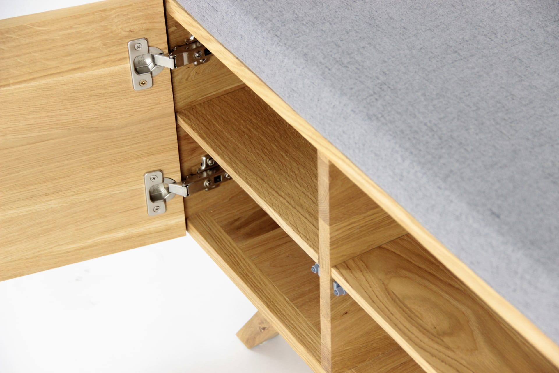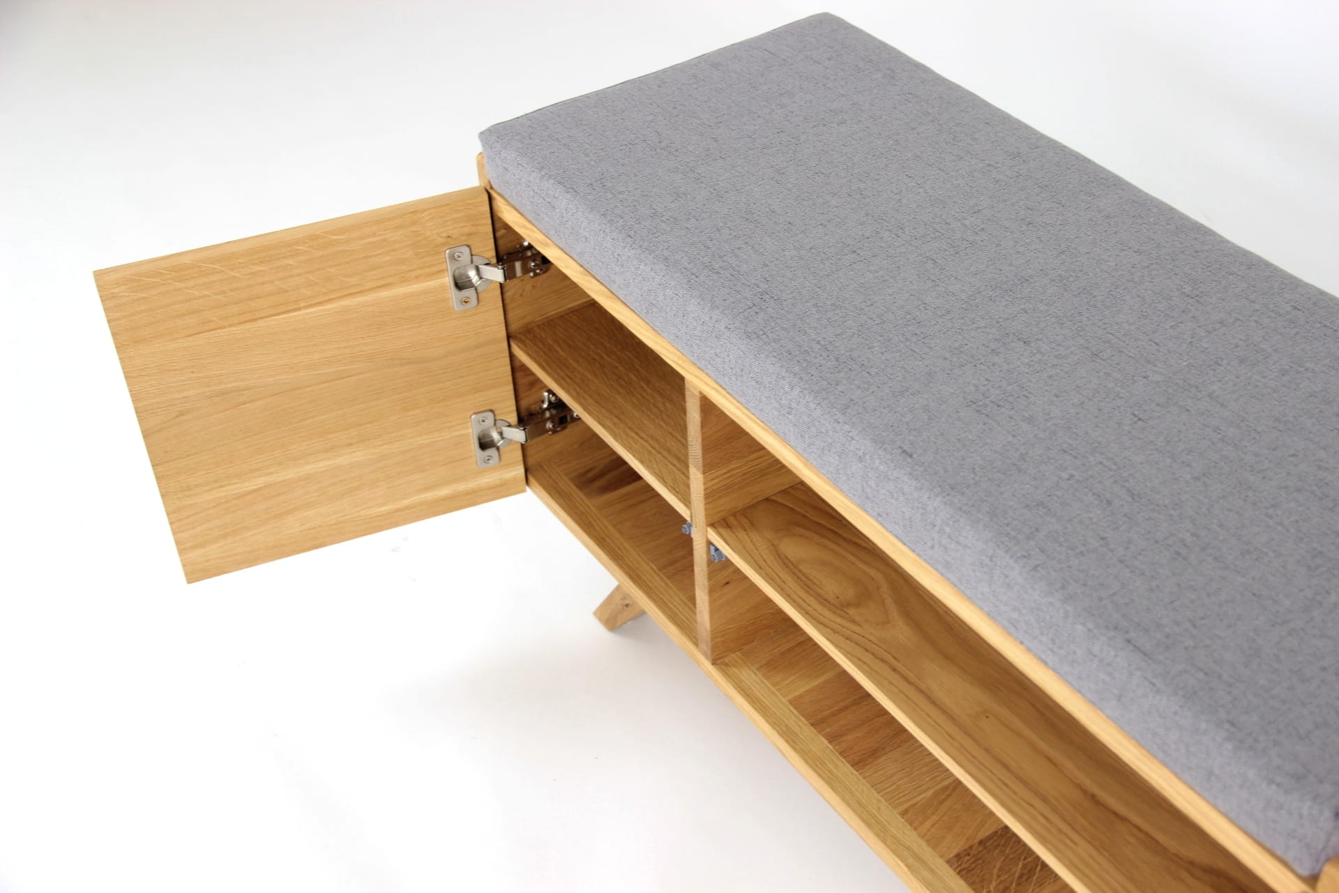 Możliwość personalizacji wymiarów ławki i kolorów poduszki sprawia, że ławka z powodzeniem może zagościć w każdym pomieszczeniu. Zaletą jest również wolna przestrzeń pod ławką którą także można swobodnie wykorzystać jako dodatkowe miejsce do przechowywania butów. Ławka może być wykonana z „plecami” lub częściowo bez dla lepszej wentylacji wnętrza. Tip-on czyli drzwi otwierane na przyciśnięcie, zawiasy Blum z cichym domykiem i pokaźna przestrzeń do przechowywania, która można dodatkowo wyposażyć w półki – wszystkie te zalety świadczą o funkcjonalności ławki Otto.