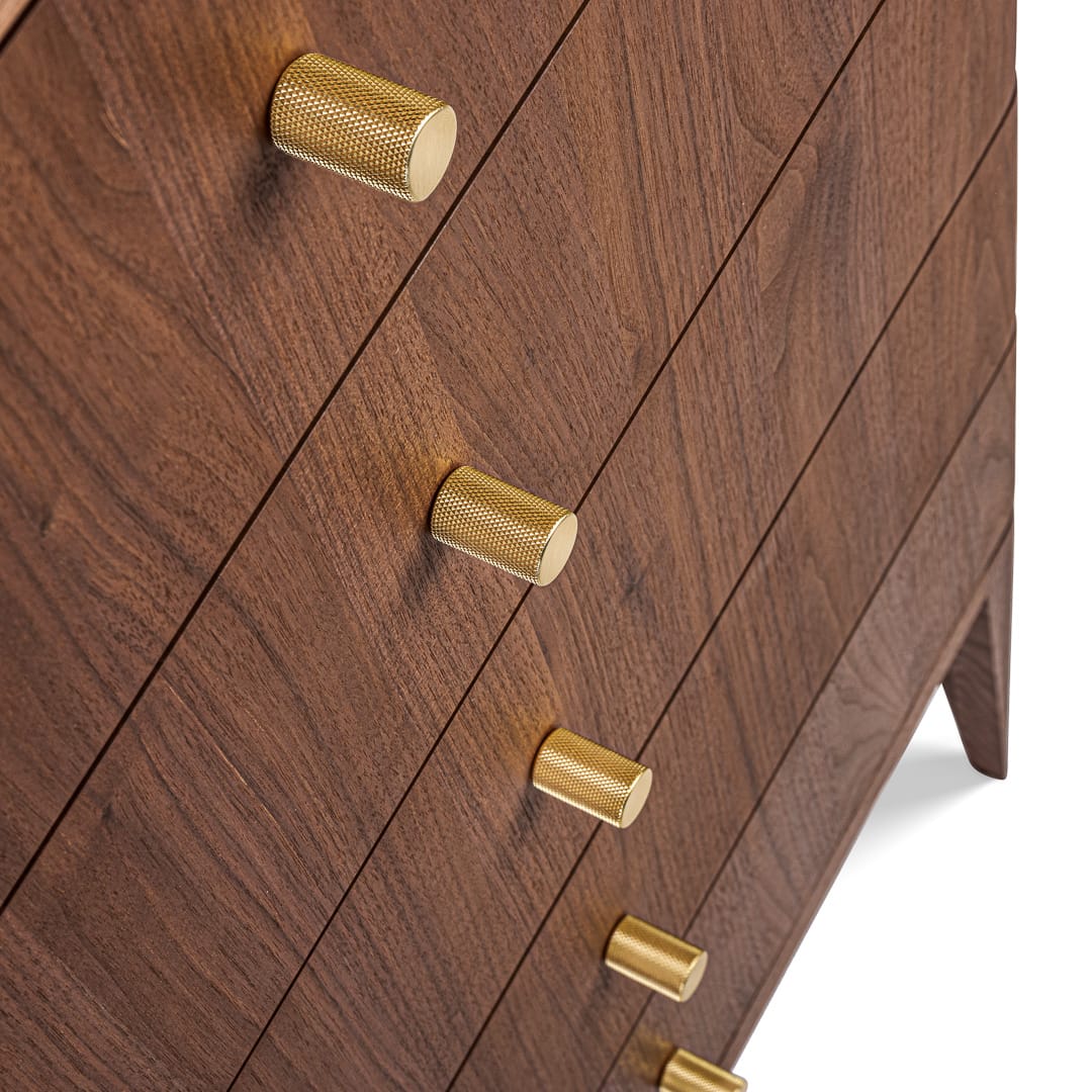 Ta wysoka komoda ma pięć pojemnych szuflad ze złotymi gałkami o wzorze diamentów. Wszystkie szuflady poruszają się na okuciach Blum z cichym domykiem. Cała zewnętrzna część została wykończona kilkoma warstwami oleju woskowego