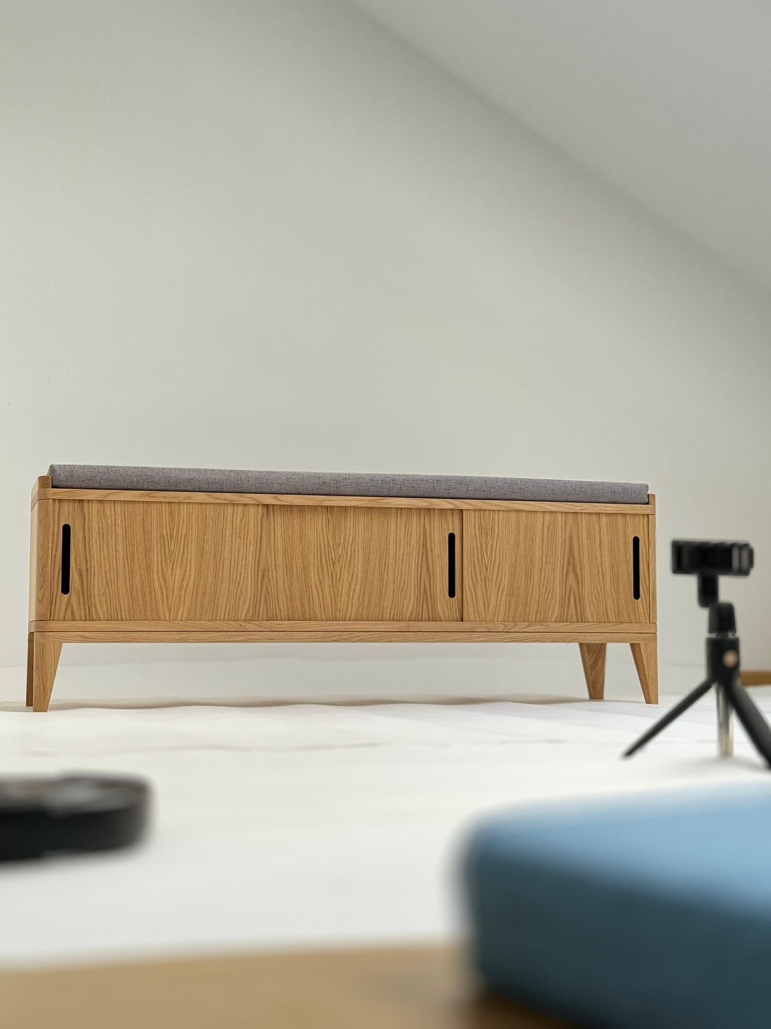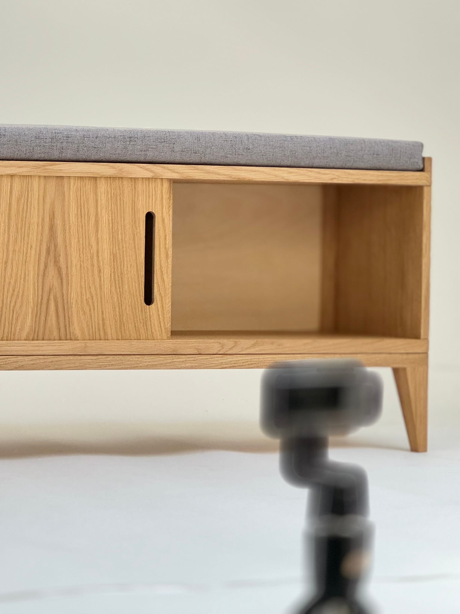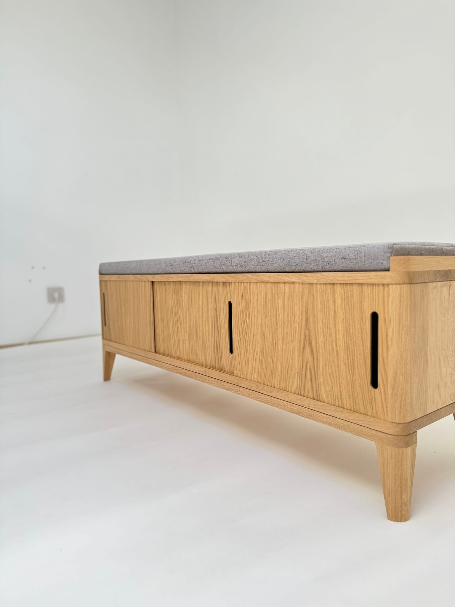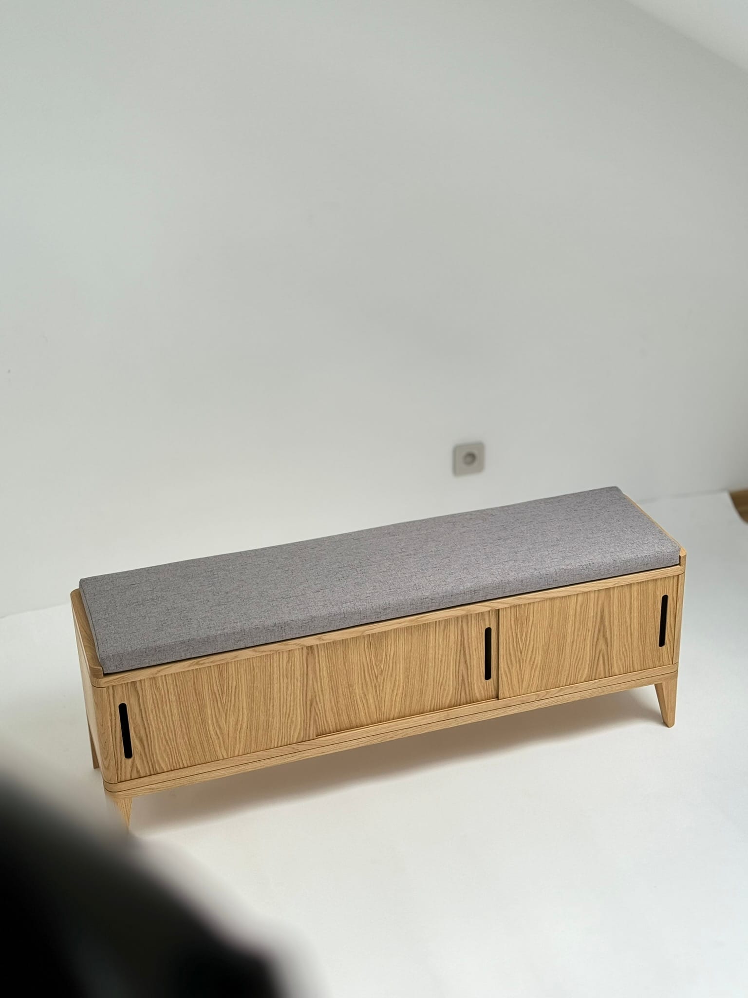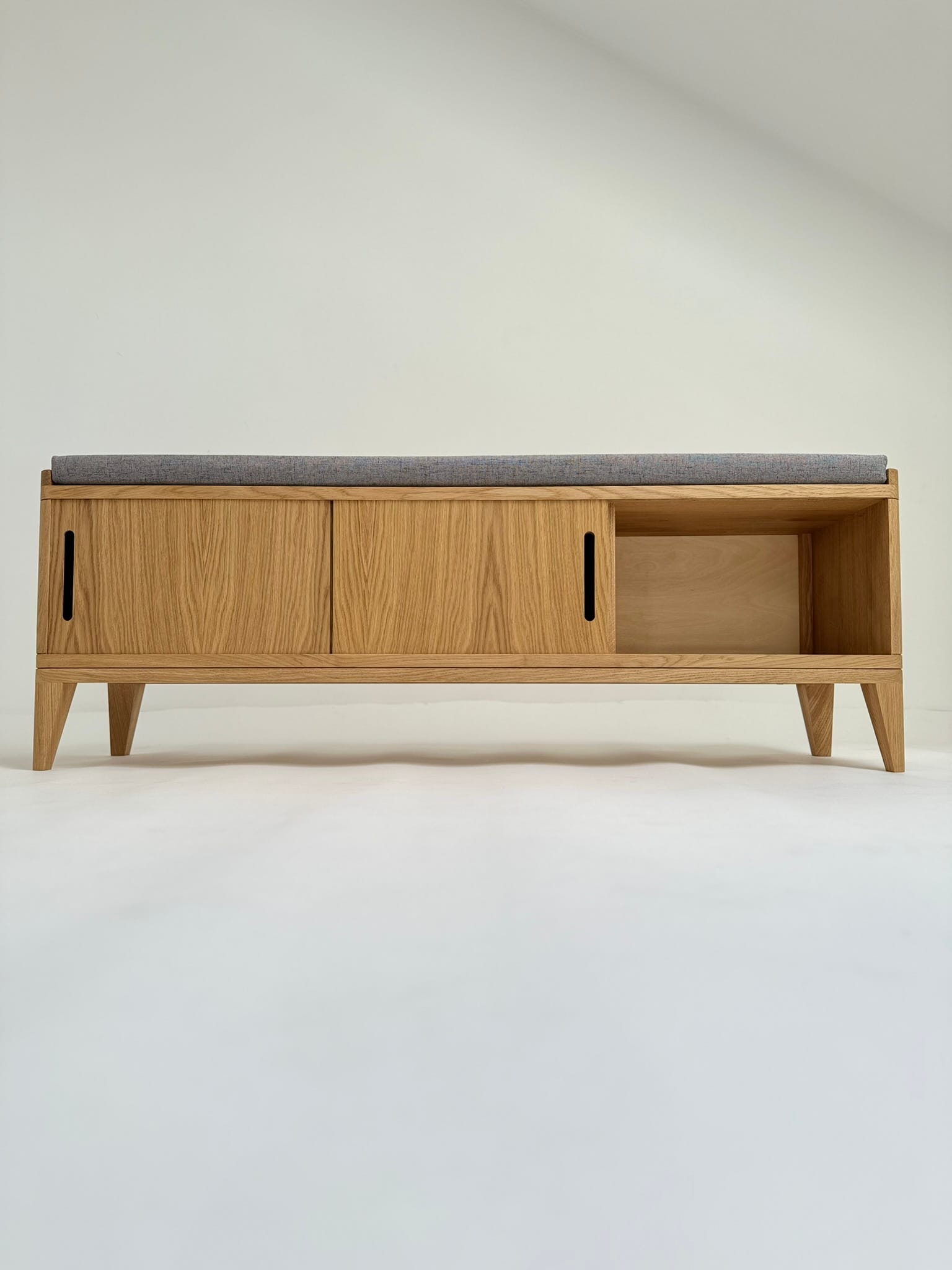 Zaprojektowaliśmy ławkę, która się po prostu podoba a inspiracją była wygoda użytkowania i praktyczność. Lekkie rozsuwane drzwi nie ograniczają przestrzeni a wytrzymała i wygodna poduszka dodaje estetyki wyglądu. Ta ławka nie potrzebuje żadnych dodatkowych elementów. Ma ponadczasowy i przemyślany design w sam raz do codziennego użytku.
