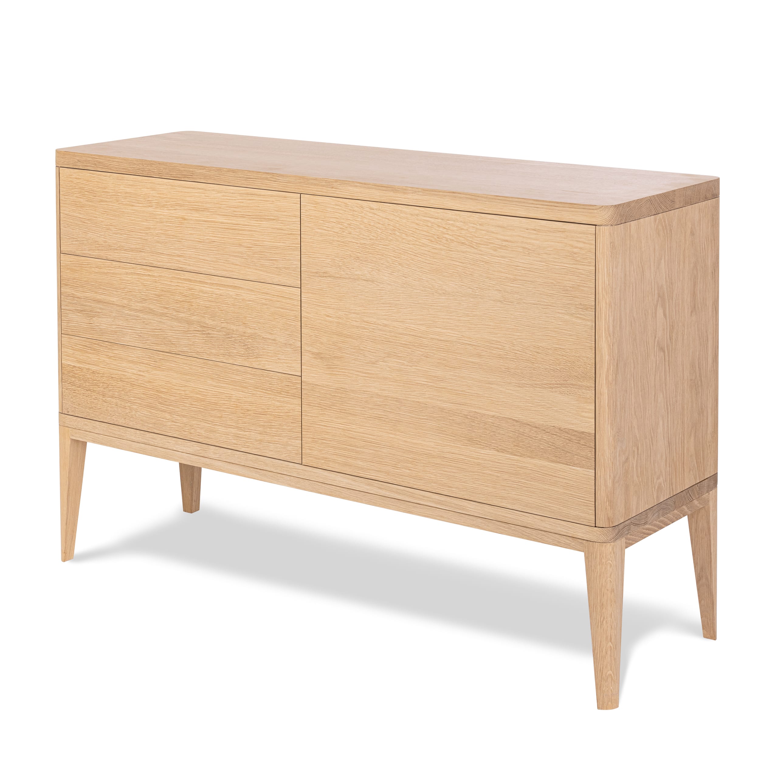 Ta komoda jest najlepszym przykładem jak piękno i funkcjonalność współgrają ze sobą. Ciekawe połączenie delikatnie zaokrąglonych linii i subtelnych wcięć to rezultat przemyślanego designu. Wykonana z polskiego drewna, wyposażona w okucia Blum i przyciągający oko design to jej największe atuty.