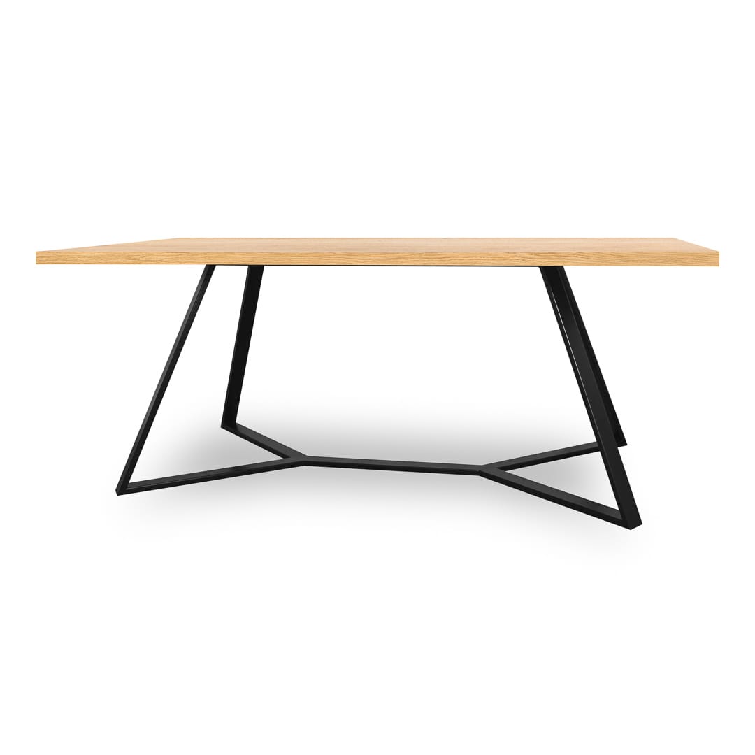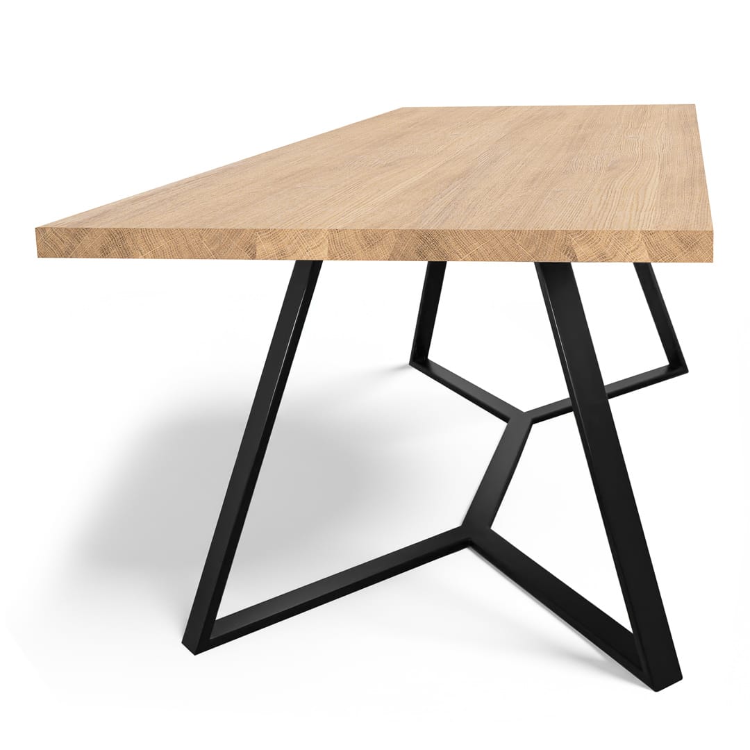 Nowoczesny design pochylonych nóg sprawił, że cały stół otrzymał minimalistyczną formę. Czarne wykończenie farbą matową i kontrastujący z nią naturalnie woskowany blat dębowy to przyjemne wizualnie połączenie.